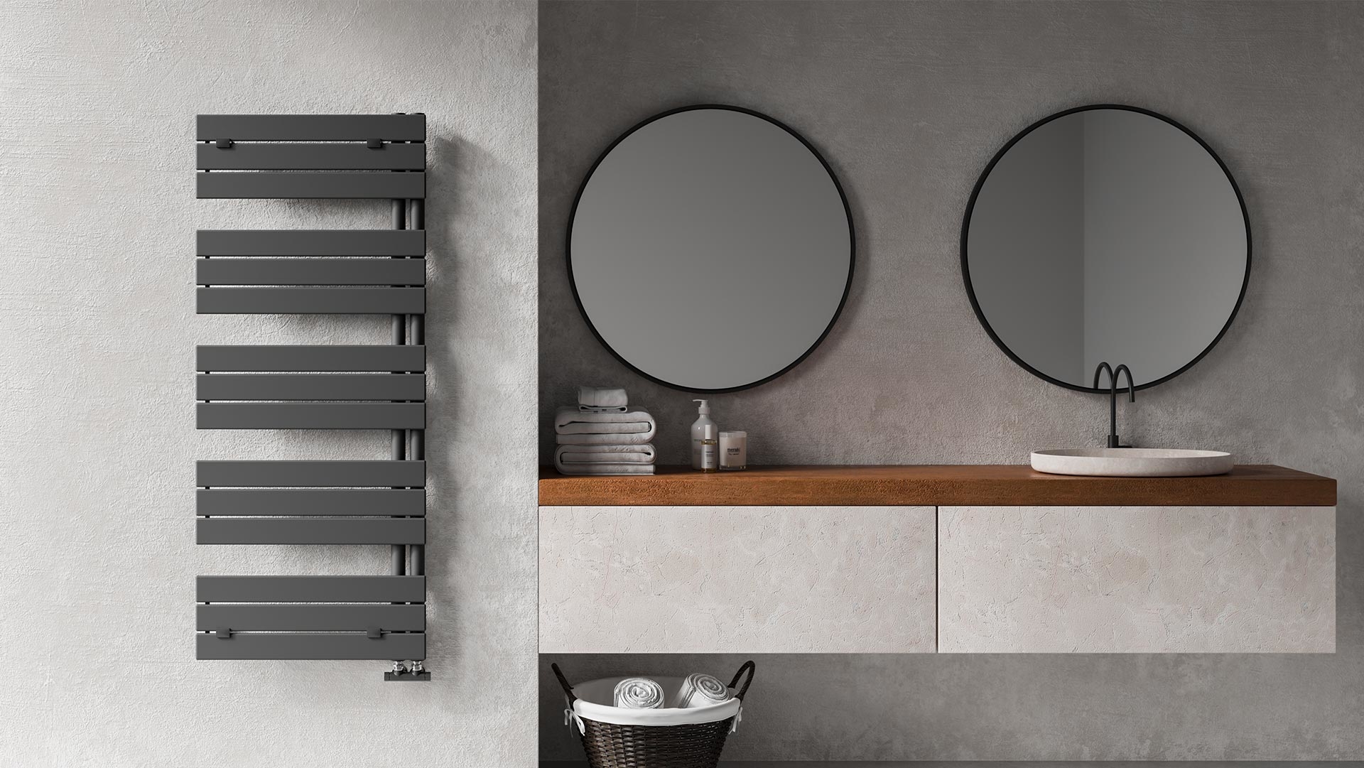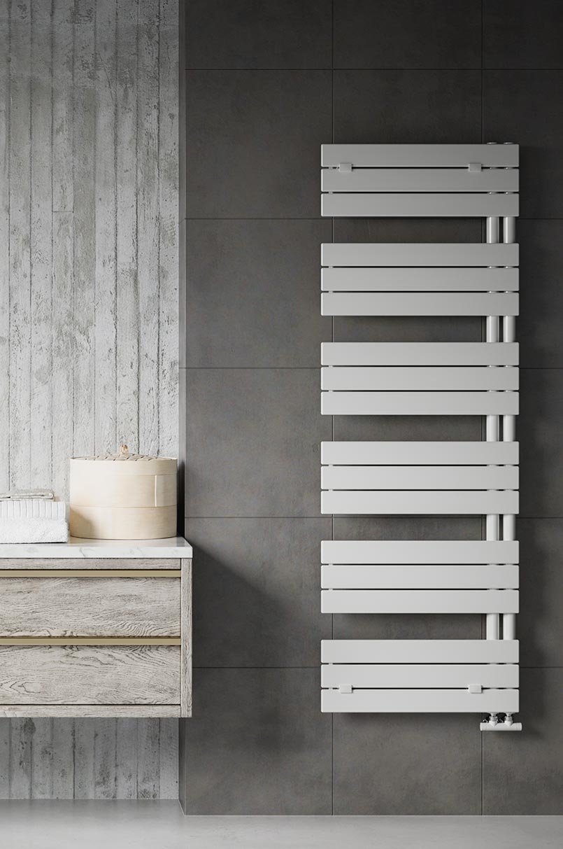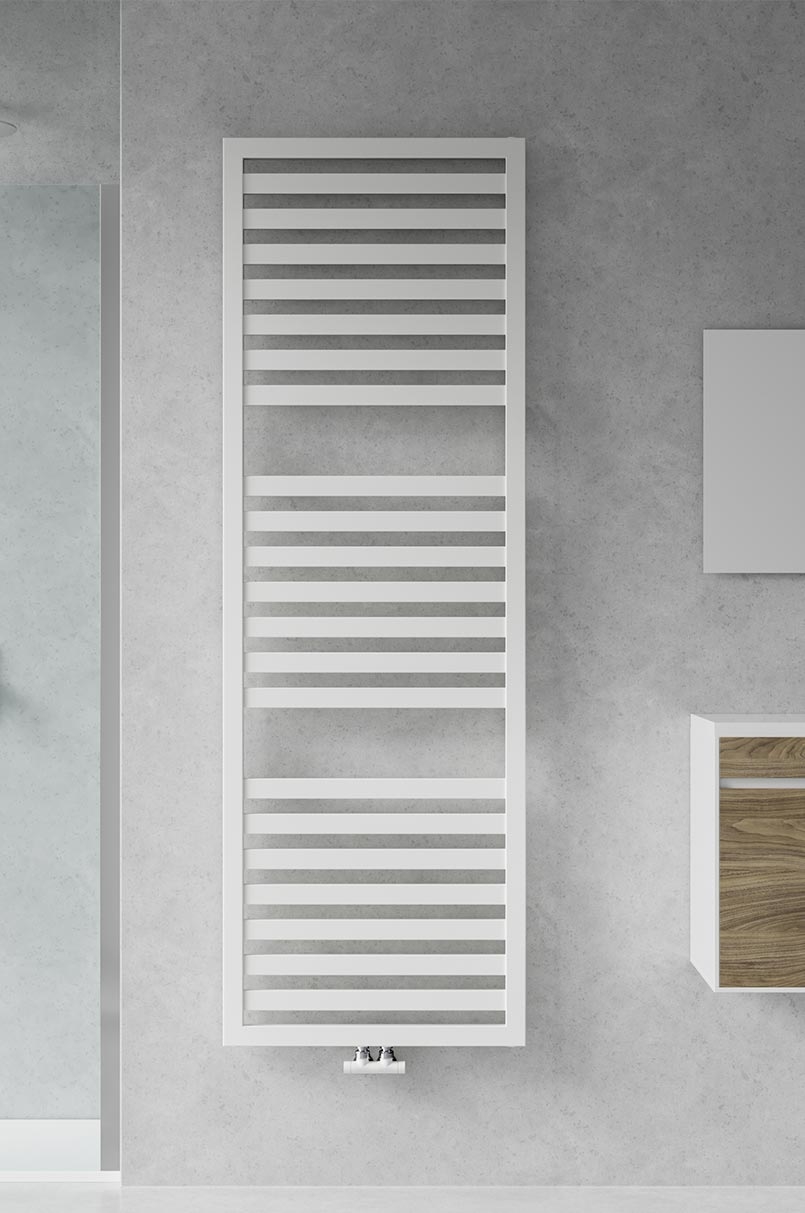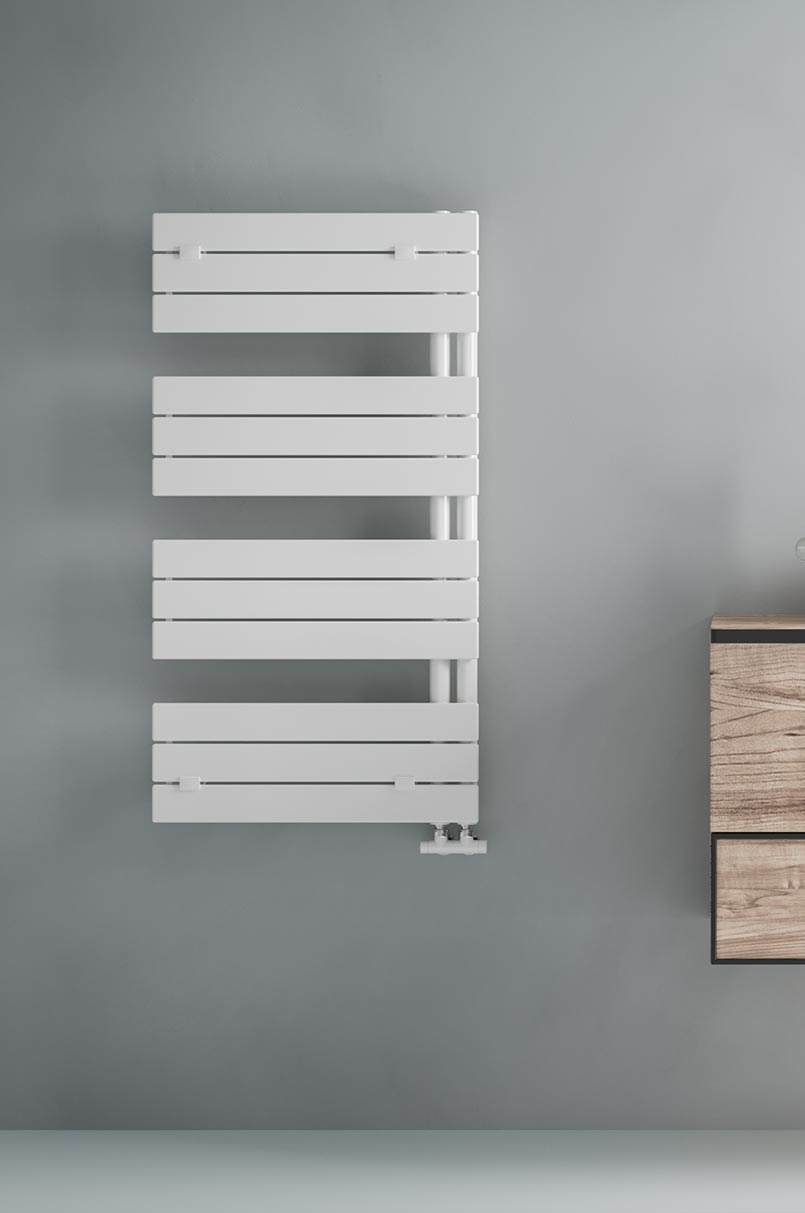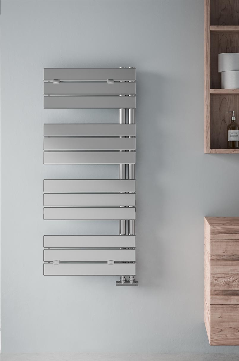 Scaldasalviette da bagno in acciaio con collettori laterali tondi dal diametro di 38 mm e tubo piatto dritto orizzontale 70x11 mm saldobrasato. Quattro mensole rettangolari.