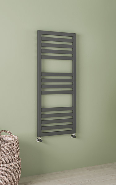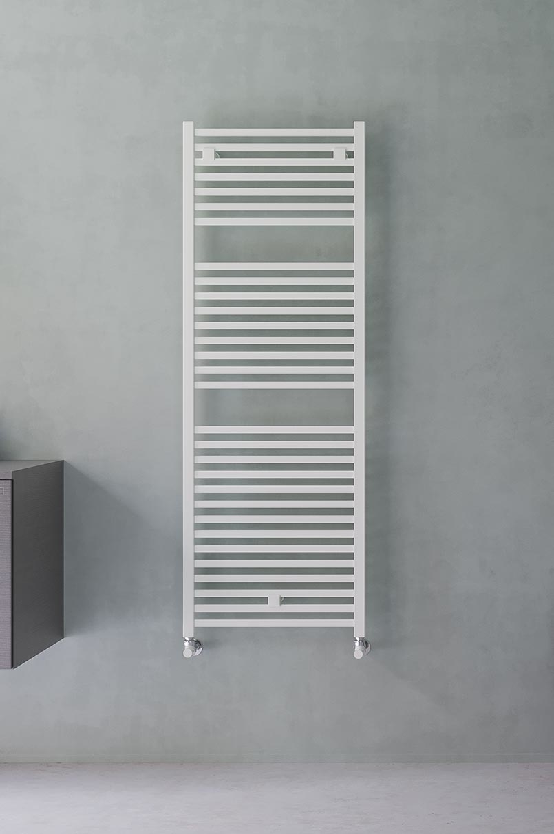 Scaldasalviette da bagno in acciaio con collettori laterali rettangolari 40x30 mm e tubo piatto orizzontale 20x40 mm saldobrasato. Mensole nascoste.