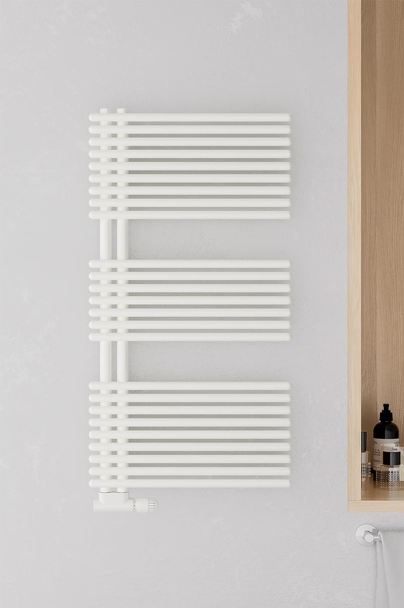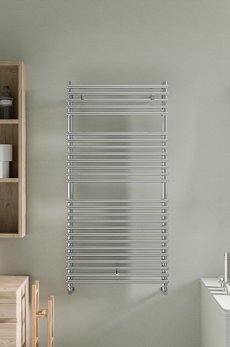 Scaldasalviette da bagno in acciaio con collettori laterali tondi dal diametro di 35 mm e tubo tondo orizzontale dal diametro di 25 mm saldobrasato. La particolarità è il punto d’incontro tra collettore e tubi orizzontali che non si sovrappongono ma si intersecano tra loro. Mensole nascoste.