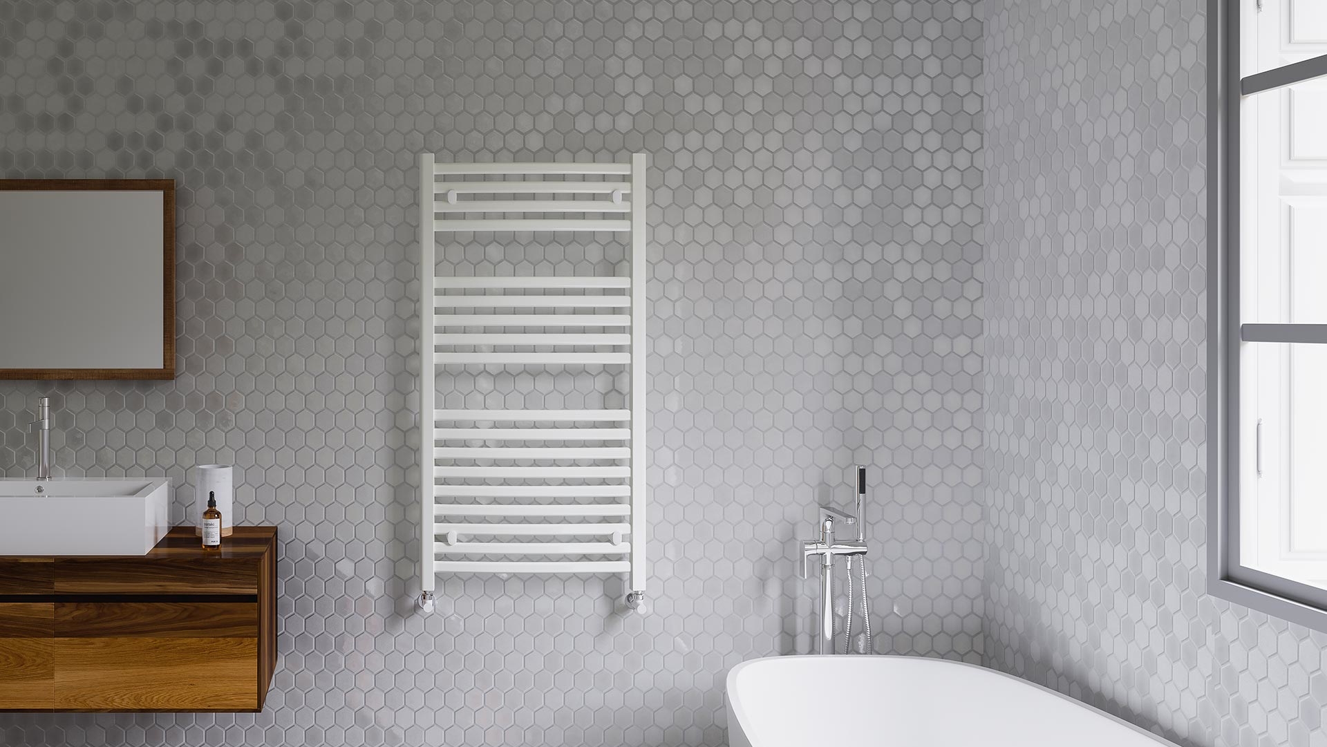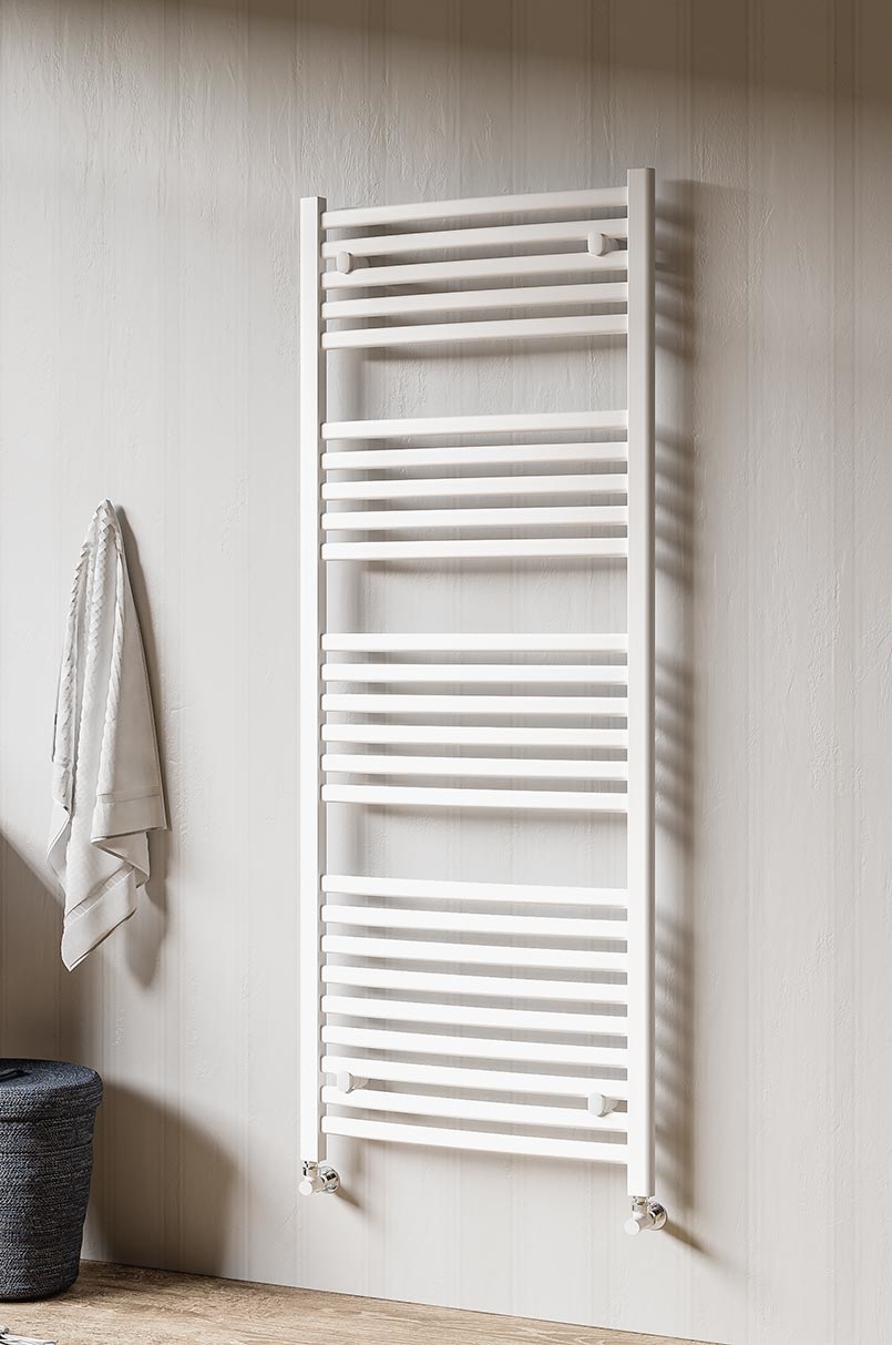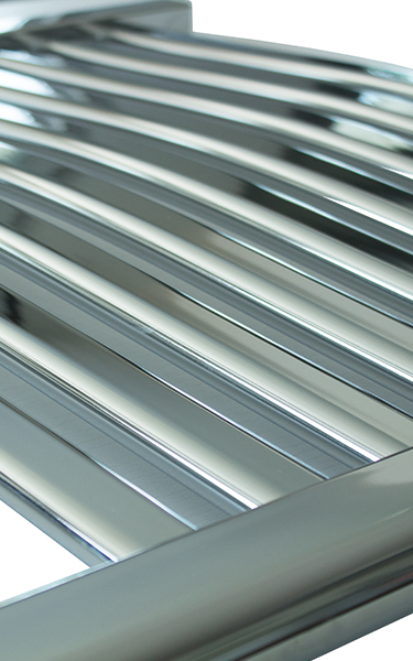 Scaldasalviette da bagno in acciaio con collettori laterali a forma di “D” 40x30 mm e tubo ovale dritto orizzontale 30x15 mm saldobrasato. Quattro mensole ovali.