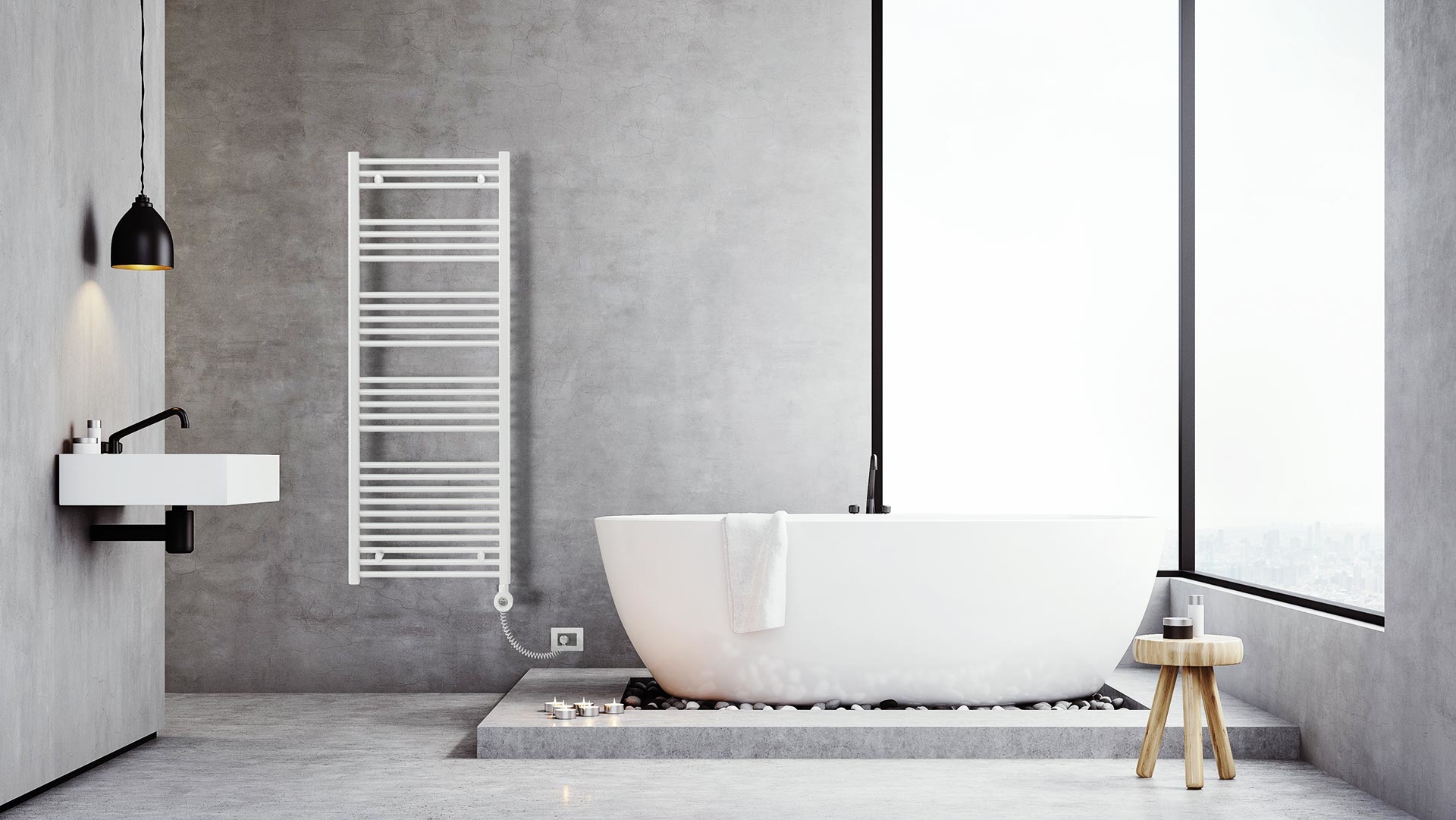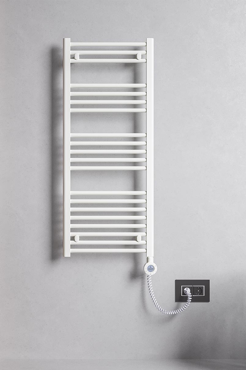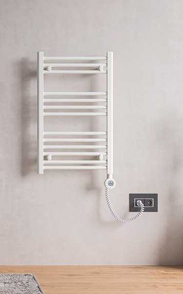 Scaldasalviette elettrico da bagno in acciaio con collettori laterali a forma di “D” 40x30 mm e tubo tondo orizzontale dal diametro di 22 mm saldobrasato. Quattro mensole ovali.